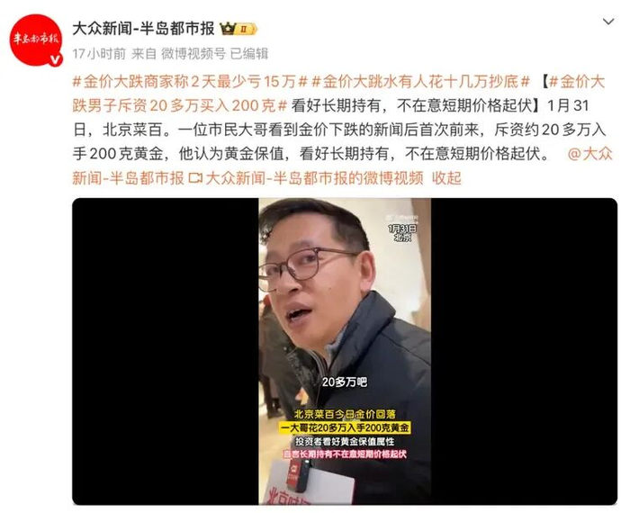 另据大众新闻-半岛都市报报道,1月31日,在北京菜百,一位市民大哥看到金价下跌的新闻后首次前来,斥资约20多万元入手200克黄金,他认为黄金保值,看好长期持有,不在意短期价格起伏。