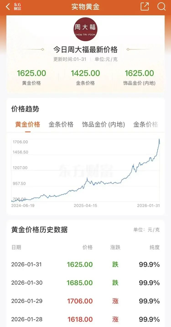 1月31日,周大福金饰报价1625元/克,周生生金饰报价1618元/克。而1月29日周大福金饰报价1706元/克、周生生金饰报价1708元/克,1月30日周大福金饰报价1685元/克、周生生金饰报价1683元/克。以此计算,周大福金饰克价在1日内跌了60元、2日跌了81元。周生生金饰克价1日跌了65元,2日跌了90元。